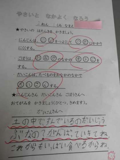 最後の振り返りのワークシートでは,野菜の働きを確認し,野菜にお手紙を書きました。