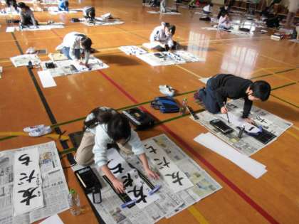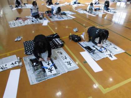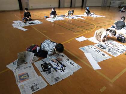 書写の時間には,「友だち」という字を画仙紙に書きました。いつも使っている半紙と違ってとても長く,扱うのに難しいので,体育館で書きました。広々とした場所に新聞紙を敷いてから習字道具の準備をしました。お手本を見て練習した後は,集中して本番に臨みました。