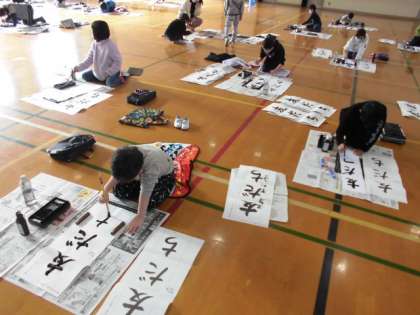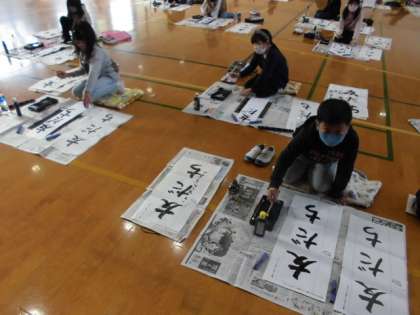 文字は3つだけど,長い紙のどこにどの字を書くか配置を考えるのが難しく,書いた後に文字が小さくなってしまったり上の方へかたよってしまったりしていました。息も静かにしながら集中して自分の納得いく字を書こうと一生懸命な姿がとてもよかったです。