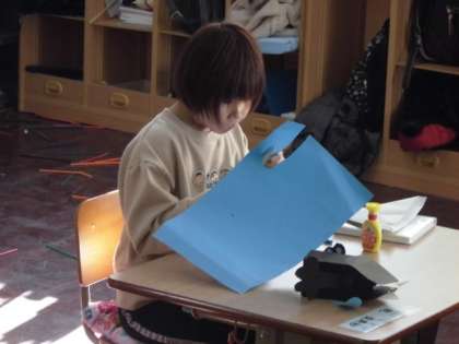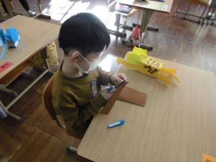 今日は,動物の体につける模様や手足を画用紙で作りました。1つ1つ丁寧に切り取らないときれいな模様が作れないので,大きさや形に気を付けて切り取っていました。どんな動物を作っているのか,だんだん分かってきました。