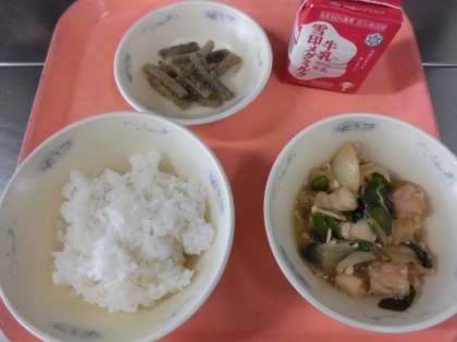 子供たちから,「『かしわのすき焼き』は,鶏肉がやわらかくて,野菜にも味がしみこんでいて,美味しかったです。『たたきごぼう』は,歯ごたえが良く,ごまの香ばしい香りがして,美味しかったです。」と,感想をくれました。