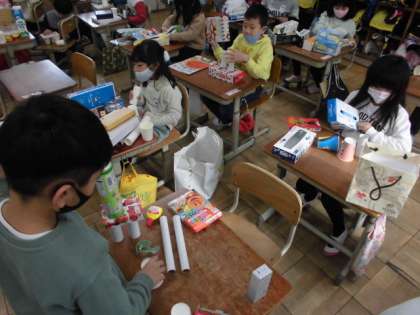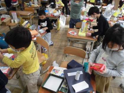 持ってきた箱の形や色,大きさなども参考にして積み重ね方をいろいろ試しながらどんなものができるか考えていました。「先生,大きな口みたい。」と箱を開けた時の様子からイメージを膨らませている子もいました。また,ラジコンカーやフラミンゴなど自分のイメージに合うように試行錯誤していました。