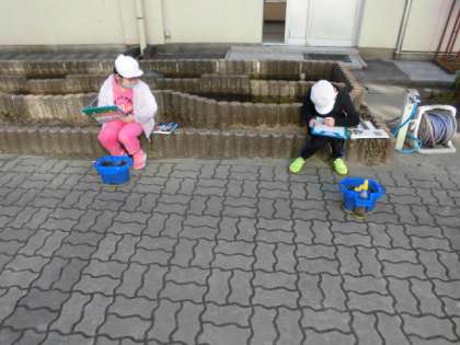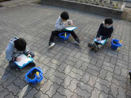 中庭で育てているクロッカスの様子を観察しに行きました。感染症対策のため外で友達と間をあけて観察しました。寒い時期ですが,土の中で少しずつ育っているクロッカスの変化をよく見ていました。芽が出てきたことや色,大きさなど自分が気づいたことを記録していました。