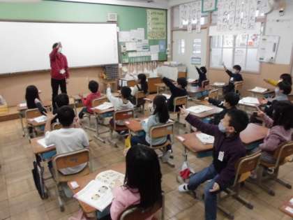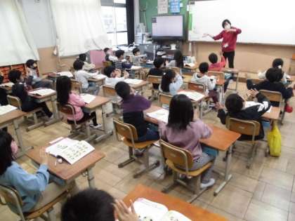 「せっ せっ せの よい よい よい」軽快なリズムが聞こえてきました。「おちゃらか ほい」の音楽に合わせて,先生とじゃんけんをしました。勝った時,負けた時,あいこの時と3つのゼスチャーを取り入れながら楽しくじゃんけんしました。