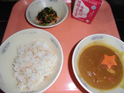 各クラスカレーの中に2つ,星型の「ハッピーキャロット」が入っていて,入っていた人には,給食委員さんが作ってくれた手作りの『しおり』のプレゼントがありました。
