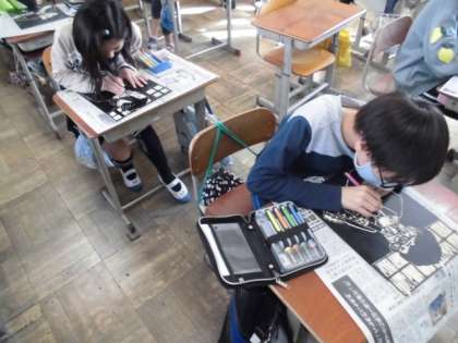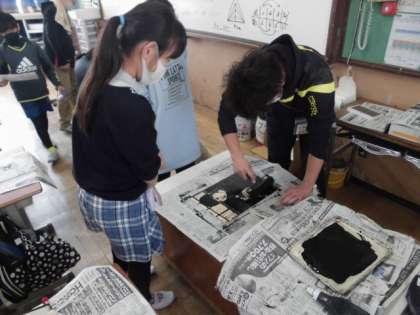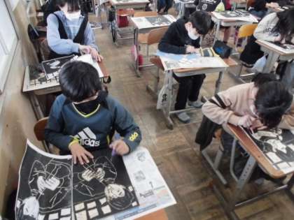図工では版画に取り組んでいますが,今日は実際に刷ってみました。こすり方や時間などで刷り上がりが違ってきます。できた作品を見て,もう少し彫った方がいいところを見つけては,どれぐらい彫るか丁寧に考えながら彫っていました。