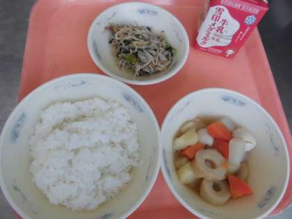 子供たちから,「『関東煮』は,一つ一つに味がしみこんでいて,うずら卵もとっても美味しかったです。『もやしと小松菜のごまいため』は,もやしのシャキシャキ感とごまの香ばしい風味が美味しかったです。」と,感想をくれました。