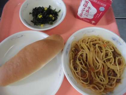 子供たちから,「『スパゲティミートソース煮』は,スパゲッティにミートソースがよくからまっていて,とっても美味しかったです。『ほうれん草のソテー』は,ほうれん草とコーンの甘みがあっていて,美味しかったです。」と,感想をくれました。