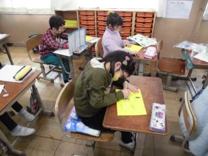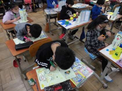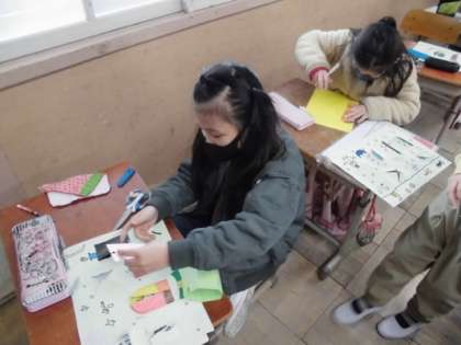 自分で作りたいものが細かくても集中してはさみを動かして少しずつ切っていました。のりで飾りを貼っていくと,窓の周りもきれいになってきました。赤とオレンジの紙を組み合わせて,上手に炎を表している子もいました。