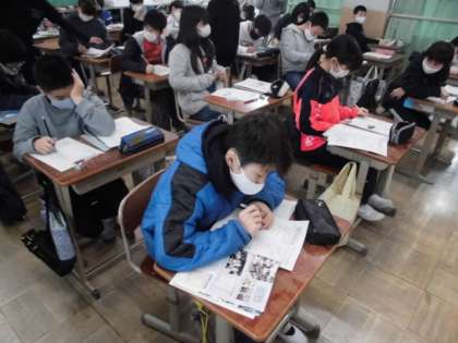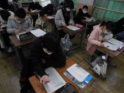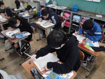 社会の時間には,戦前から戦後にかけて学習したことのまとめをしました。学習プリントに取り組む中,分からない時は自分のノートや教科書を見ながらおさらいしていました。