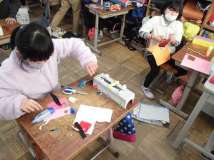 先に部品を全部作ってから組み立てていく人もいれば,部品がなくならないようにできた部品をすぐに貼っていく人もいました。少しずつ形になってくると,新たな発想が生まれるようでした。