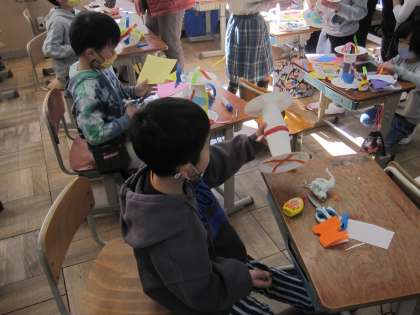 転がり方や見え方がどうなるかをイメージしながら,色や形を工夫して飾りつけていました。途中で,どんなふうに転がるかを試す子もいて,楽しみながら,思い思いにおもちゃを仕上げていくことができました。