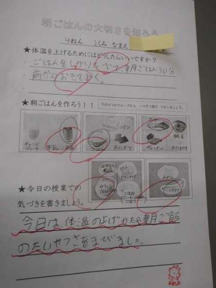 振りかえりのワークシートでは,自分の食べたい朝ごはんを選び,作りました。前に出てきてくれた2人の朝ごはんは,まったく同じものでした!!