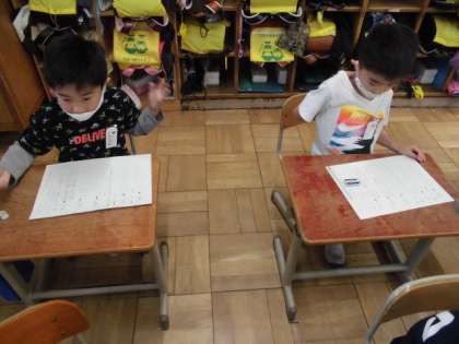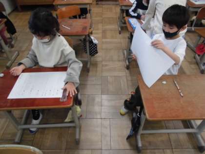 「まと(的)」に一文字足して「とまと」,「さら(皿)」に一文字足して「サラダ」,というふうにもともとある言葉に一文字足すことで変身する言葉を考えました。「たい」や「いか」などにどんな一文字を加えるか考えた後,お友達の意見も参考にしました。