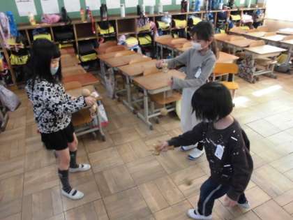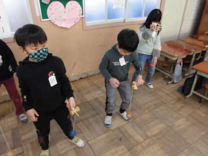 日本には,凧揚げや福笑いなどお正月ならではの遊びがあります。今日は,けん玉やめんこ,コマなどに挑戦して遊びました。うまく玉がお皿の上に乗ると「先生,できた。」と嬉しそうに見せてくれました。