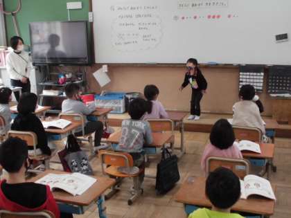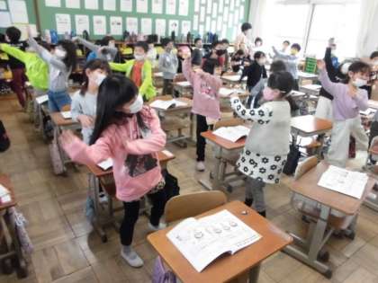 「とんくるりん ぱんくるりん みんなでおどろう」という歌に合わせて,どんな動きがいいか考えて踊ってみました。自分の考えた動きを発表したり,みんなで楽しそうに動きをそろえていました。