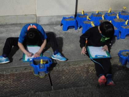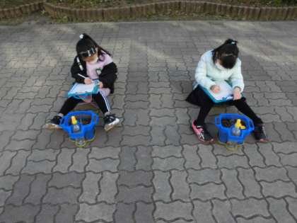今日の午後は天気もいいので,中庭でクロッカスの観察をしました。自分の鉢を持って移動した後,前回と比べてどうなっているか観察しました。色や大きさなど詳しくカードに書いたり「先生,芽が大きくなっている。」と教えてくれたりしました。
