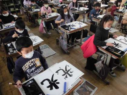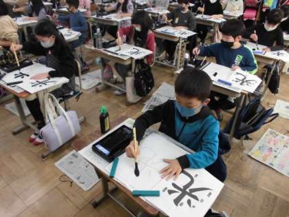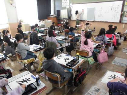 いつも以上に姿勢や持ち方に気を付けて「光」という字を書きました。まず。プリントに練習しましたが,横画・たて画・はらい・はね等,気を付けることがたくさんあるので,なかなかうまく書けません。それでも,お手本を見ながら集中して筆を動かしていました。