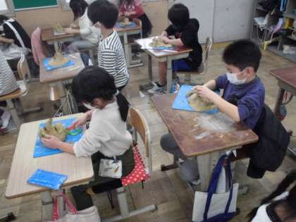 しっかりこねるのも力が必要です。冷たい粘土をしっかりこねてから,丸や四角,山など土台となる部分を作ってから,くり抜いている子もいました。自分の中には想像した建物があるようで,手を止めることなく,作業を進めていました。