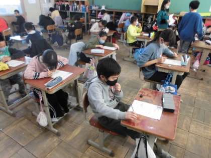 算数の「変わり方」についての学習を終え,今日は,練習問題に挑戦しました。三角形が増えると周りの長さはどうなるのか,表に整理したり式に表したりしました。