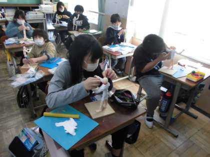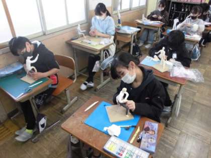 骨組みに肉付けができたので,今日は,粘土に絵の具を混ぜ込んで,自分好みの色を作り,服や小道具を作りました。スポーツする自分ならユニフォームを着せたり黒の粘土を作って髪の毛や目をつけたりしていました。少しずつ将来の自分が見えてきています。