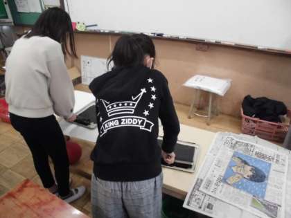 ようやく彫り終わったので,紙に刷りました。寒いせいか,インクがなかなか伸びてくれませんでしたが,ローラーで徐々に伸ばしていました。思い切って板にインクをつけ,擦り出していました。