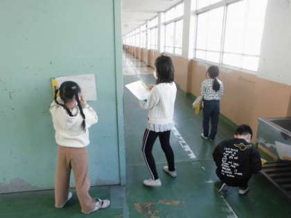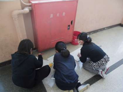 学校には火事に備えて,消火器や警報器などいろんなものがあります。今日は,各階に分かれて,どんなものがあるか探して見つけたことを記録しました。「この扉もそうなのかな。」と大きな扉を見つけていました。