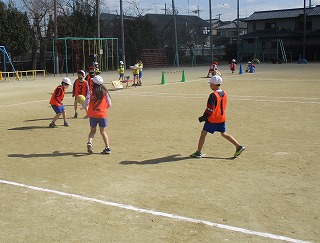 体育ではボールけりゲームに取り組んでいます。密にならないように,数人のグループでパスをして,ボールを前へ進める活動をしました。どこに動いたらよいのか,ボールをどう蹴ったらよいか考えながら取り組んでいました。