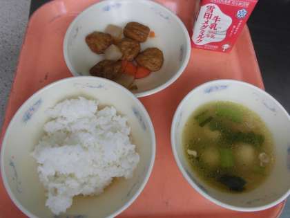 「ふあふあだんご」は,給食室で,豆腐・白玉粉をこねて生地を作り,一つずつ丸めた手作りのだんごです。ふあふあとしたやわらかい食感を楽しみに味わって食べました。
