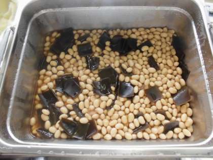『こんぶ豆』は,昔から食べられてきたおかずの一つです。大豆と切りこんぶを三温糖・みりん・醤油で調味して,スチームコンベクションオーブンを使って作りました。口の中でこんぶのうま味や,ふっくらした大豆のやさしいあま味を味わって食べました。
