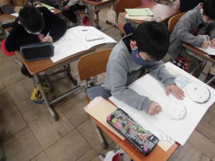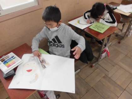 生活科では,「自分ものがたり」を作っています。おうちの人に教えてもらったことや小さい頃の写真などを使って,画用紙や巻き物にまとめています。「先生,見て。」と出来上がりつつある物語の一部を見せてくれました。