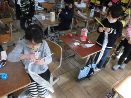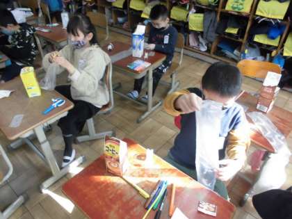 今日の図工では,牛乳パックとストロー,ビニル袋を使って,にょきにょきっと飛び出す仕組みを作りました。牛乳パックを切ってふたつきの箱を作り,ストローとビニル袋をセロハンテープでくっつけていきます。袋が膨らむ仕組みが分かると,意欲がわいていました。