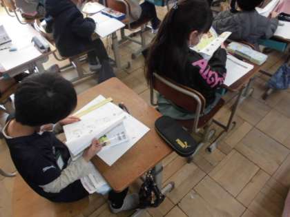 1箱に12個のお菓子が入っています。1/2や1/3するといくつになるか考えました。ノートに図を描いて考えると分かりやすいという意見がありました。18個の場合はどうなるか分かった人が前に出てきて,タブレットの画面に線を引いて分けくれました。
