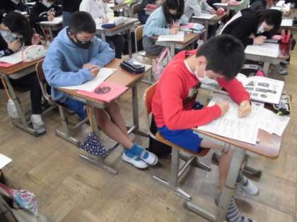 今日の理科の時間は,プリントに取り組むことでこれまでの学習のおさらいをしました。私たちは呼吸によって酸素を取り入れ二酸化炭素を出しますが,植物はその逆をしてくれます。私たち人間を含めて,生物と環境にはいろんなつながりがあることに改めて気づいていました。