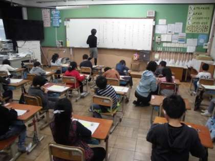 国語の時間には,学校にあるものの中から自分で1つ選んでクイズを考えました。例えば,1.まるいかたちをしています 2.すうじがかいています 3.いつもうごいています というふうにヒントをいくつか出しながら「時計」と答えてもらいます。今日は,自分で考えたヒントをもとに問題文を作りました。