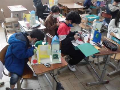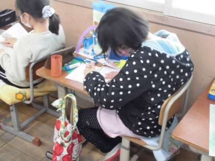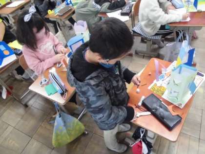 図工では「まどをひらいて」の工作に取り組んできました。窓を開くとどんなものが見えるのか想像して作ってきました。背景もきれいに出来上がり,今日は,自分の作品を紹介するカードを作りました。