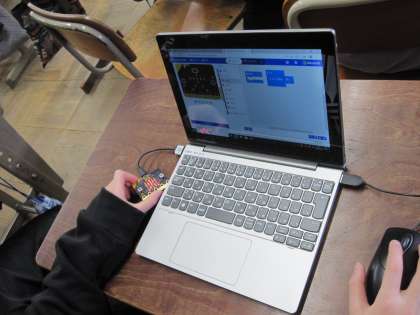 電気の性質や働きを利用した道具には,その働きを目的に合わせて制御したり,電気を効率よく利用したりする工夫がなされていることを,実際に,電気を効率よく利用するためのプログラムを「メイクコード」というプログラミングソフトを使って作成し,「マイクロビット」という装置を使って確かめました。