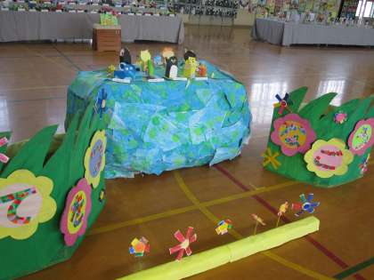 体育館での作品展には,「てをつなごう」の作品を飾っています。