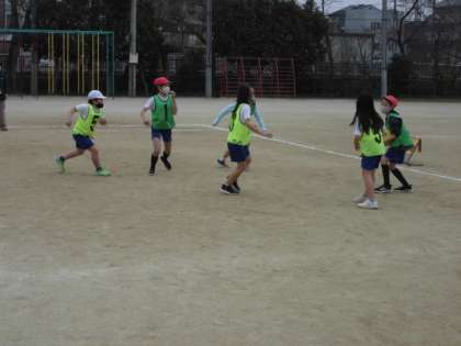 体育の時間には,エンドボールをしました。バスケットボールとは違い,ゴールマンにボールを渡せば得点が入ります。味方同士でパスをつなぎながら,ゴールマンがキャッチしやすいボールを投げる必要があります。どのチームもフワッとした感じのパスを心がけていました。