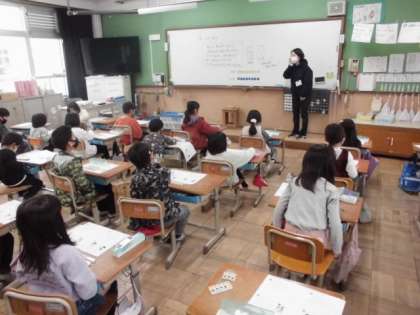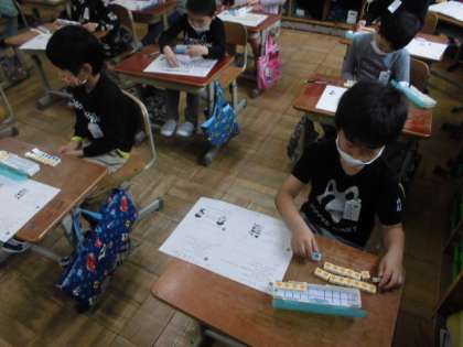 算数の時間には,復習プリントに取り組みました。金魚すくいをした時,8匹すくった人よりも4匹多かったそうです。一体,何匹すくったのでしょう。これまでよく使った数図ブロックを取り出して,まず8個並べてからどうすれば求められるか考えました。