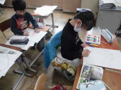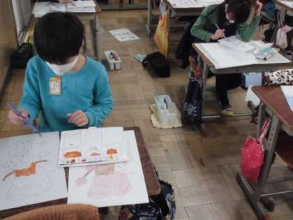 ありすの小径のライトアップに使う「あんどん」に絵を描きました。京都らしいものや春らしいものなど自分でテーマを決めて描いていました。きれいな桜の花びらが印象的でした。