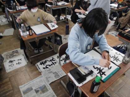 文字の組み立てや筆順,大きさ,バランスなど学習したことを生かして「考える子」を書きました。漢字が大きくなり過ぎたり筆先が割れたりしていましたが,集中を切らさず丁寧に書いていました。