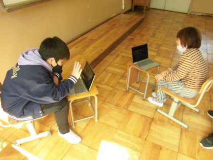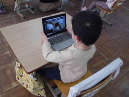 パスワードやIDを入力してタブレットを立ち上げる方法を教えてもらいました。最初は,GIGA端末を使うことに少し戸惑っていました。さらに,ZOOMでつながることが本当にできるのか心配していましたが,みんなの顔が画面に現れると,嬉しそうにしていました。