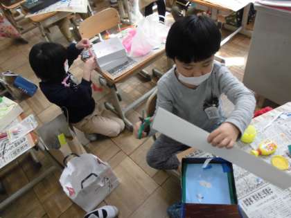 図工の時間には,何かを入れる箱に飾りをつけました。キラキラひかるモールやカラフルな色紙を貼ってきれいに飾りつけしていました。何を入れるの?と聞くと,キーホルダーや文房具などそれぞれ入れるものを決めていました。