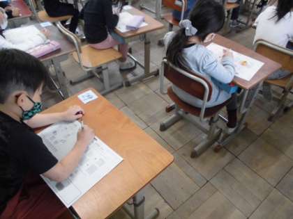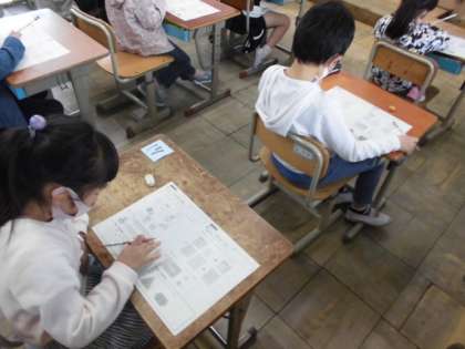 2年生は,算数のおさらいプリントに取り組みました。1年生の時に学習したことですが,春休みもあったので思い出しながら問題を解いていました。