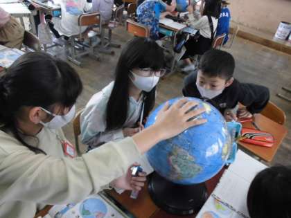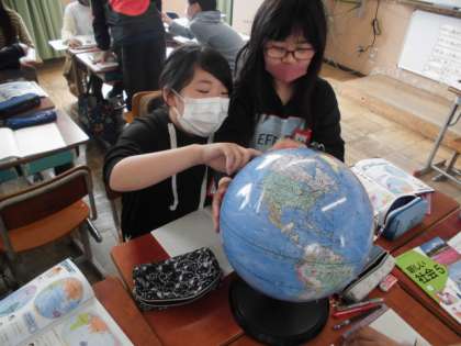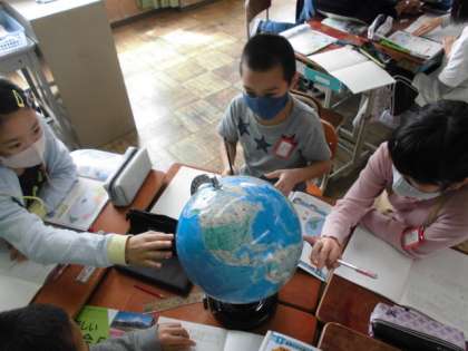 社会の時間には,地球儀を見て気づいたことからこれからの学習問題を作りました。北極や南極があることや思っていたより日本が小さいことなど,いろんなことに気づいていました。