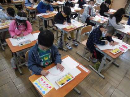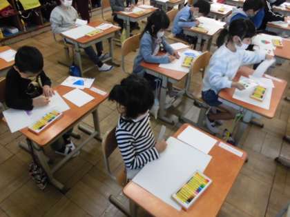 描きたいことが決まったら,どんどんイメージを膨らませて描いていました。美味しそうないちごやスイカ,いろんな色をしたりんご,強そうな恐竜などいろんな絵をたくさん描いて楽しそうでした。