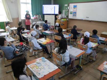 昨日から給食が始まりました。給食前には,今日の献立を確認しました。昨日はパンだったけど今日はご飯でした。おかずはどんな味がするのか想像しながら聞いていました。その後,当番の人は,手をしっかり洗って準備していました。