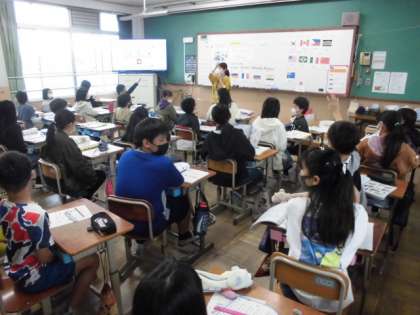 外国語の時間には,出身地やできることを尋ねる言い方を学習しました。「Where are you from?」と出身地を聞くと,「I’m from 〜」と答えます。クイズ形式で何度も発音することで慣れ親しんでいました。