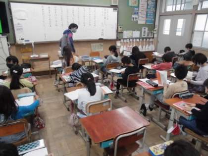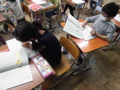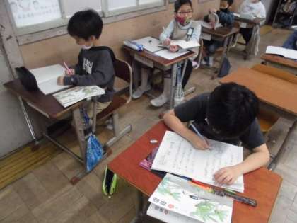 今日の国語では,「どきん」という詩に各自で考えた言葉を入れながら,想像を広げていました。自分の中ではイメージができているようで,自分で考えた詩にあった挿絵を描いていました。